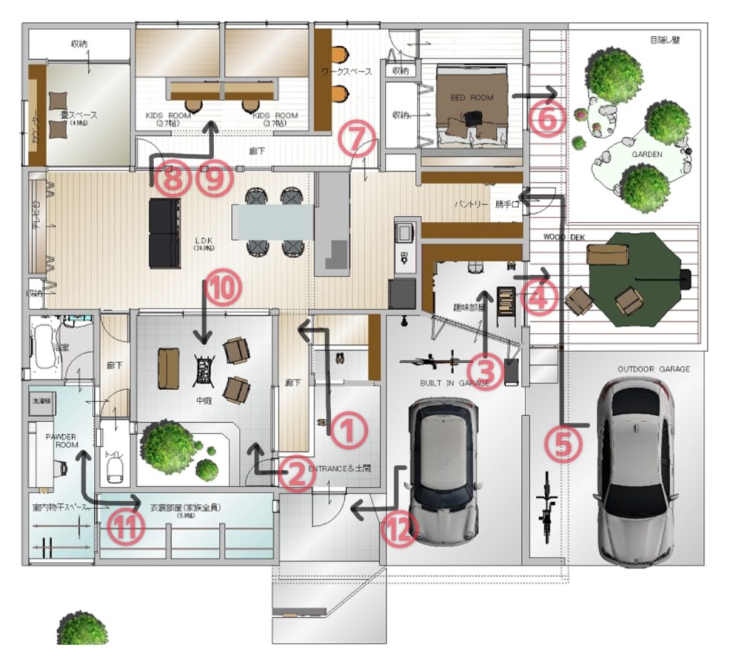 暮らしを楽しむ理想の平屋|間取り・ガレージパース|岡山・倉敷でおしゃれな注文住宅を手がける工務店【意匠堂】